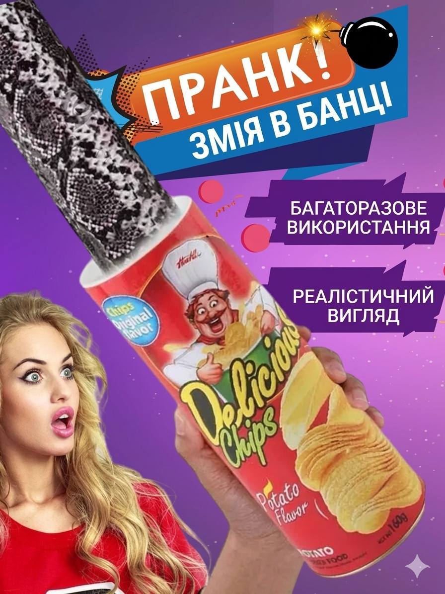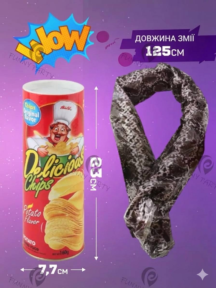 Банка з чіпсами- це весела банка для розіграшів. Натисни на неї і раптово вилетить «змія ». Люди думають, що зараз просто поїдять чіпси…